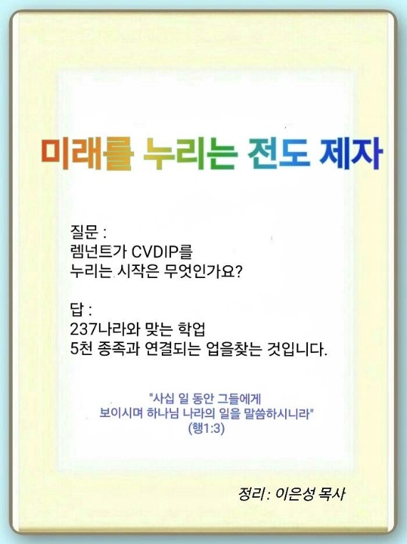 세상 사람들의 50%는 질병이나 가난, 정체성의 부족으로 자신의 신분과 권세를 알지 못하여 어렵다고 느낍니다. 우리가 이런 사람들을 살려야 합니다. 중직자의 50%는 자신의 집이나 교회에서 Healing House를 하고, 산업과 삶 속에서는 TCK House가 있어야 합니다. 이를 통해 Holy Mason으로서 발자취와 기념관을 남겨야 합니다. 렘넌트들은 시대 살릴 달란트를 미리 준비하고, 237과 맞는 학업, 5천 종족과 연결되는 업을 반드시 찾아내야 합니다. 여기에서 본격적인 언약이 잡혀야 됩니다. 이 속에서 나오는 비전이라야 되는 것입니다. 우리는 모든 일을 해나갈 때 예수께서 주신 대로 해야 합니다.