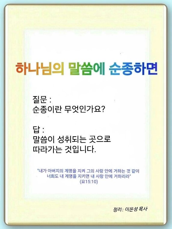 예수께서는 하나님의 뜻을 이루는 것이 가장 중요하다고 하셨습니다.(요 4:34) 그 안에는 삼위일체의 비밀이 있습니다.(요 8:29) 순종은 그리스도를 사랑하는 것이고, 그 사랑의 결과로 하나님이 자신을 나타내신다고 하셨습니다.(요 14:15, 21) 하나님의 생각과 말씀이 옳다는 것을 깨닫는 것이 순종입니다.