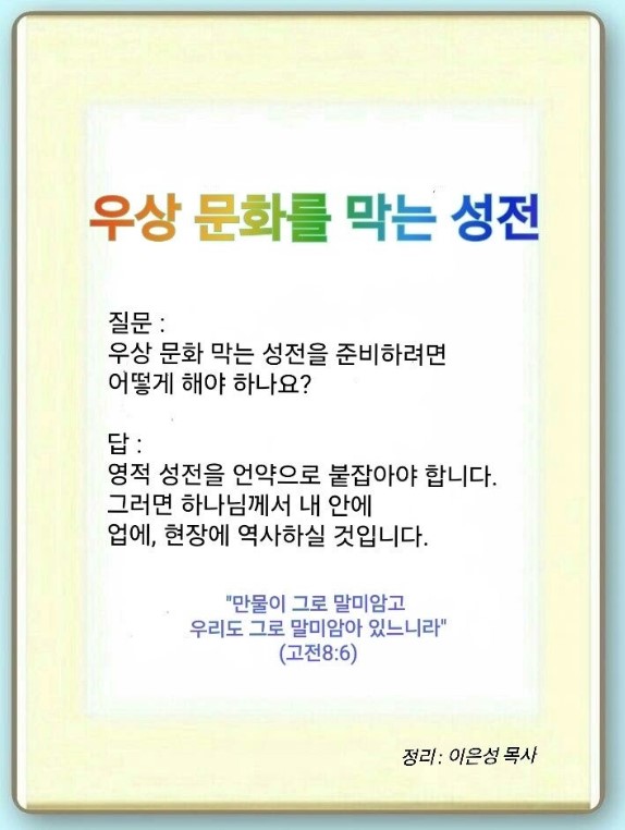 우리는 우상 문화 막는 성전을 준비해야 합니다. 미국도 3단체 때문에 심각합니다. 우리가 언약을 정확하게 붙잡는다면 분명히 역사가 일어납니다. 우상 문화 막는 성전을 준비하려면 다섯 가지를 해야 합니다.