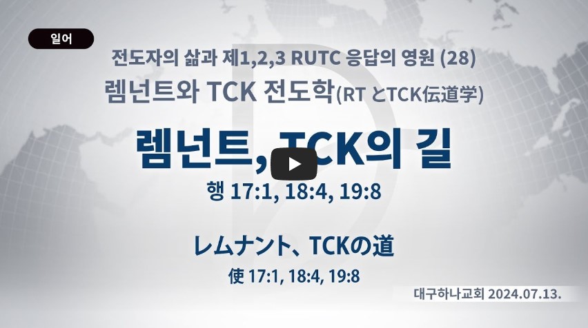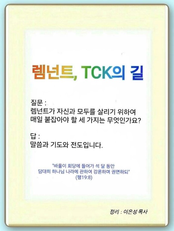 렘넌트는 세 가지 길을(말씀, 기도, 전도) 따라가야 합니다. 첫째, 하나님의 말씀이 나에게 어떻게 임하고 있는지 확인해야 합니다. 나에게 전혀 말씀이 안 보이면 더 밑으로 내려가면 됩니다. 그래야 최고를 향해 갈 수 있습니다. 둘째, 내가 기도를 어떻게 하고 있는지, 나의 기도를 찾아야 합니다. 이것을 찾을 때, 모든 것이 회복됩니다. 그러면, 렘넌트는 무엇을 할까 걱정할 필요 없이, 기도 응답을 따라가면 됩니다. 셋째, 나는 앞으로 어떤 전도를, 어떻게 할 것인지 나의 전도를 확정해야 합니다.