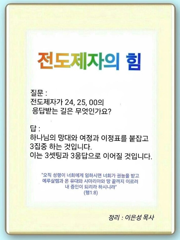 많은 사람이 내 생애 최고의 응답받는 것을 원합니다. 그러면 응답이 무엇일까요? 하루 종일 24의 힘으로 25 응답을 기다리고 영원한 작품을 누리는 기도가 응답입니다. 우리가 하루 종일 하나님의 능력을 누리고 하나님 나라 응답을 기다리고 세계복음화라는 작품을 기다리는 이 자체가 응답입니다. 그래서 기준은 24입니다. 그리스도께서 주신 7망대, 7여정, 7이정표를 가지고 3집중하는 것입니다. 그러면 저절로 플랫폼, 파수대, 안테나가 세팅됩니다. 그때 문제, 갈등, 위기 속으로 가는 것이 3응답입니다. 드디어 업에 300%를 누리게 됩니다. 이때부터 교회와 현장에 중요한 응답이 계속 일어나게 됩니다. 예수의 공생애 3년 동안 성령의 역사를 약속하셨고 40일 동안 보좌의 능력을 말씀하셨습니다. 마가 다락방에서 성령을 체험한 후 예배가 살아나고 말씀이 성취되는 것을 보았습니다. 이때 24·25·00의 응답이 옵니다. 그렇다면 우리가 이 힘을 얻으면 어떻게 될까요?
