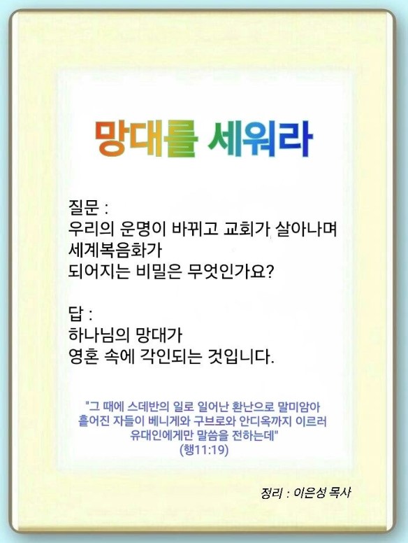 조직하는 것입니다. 이것을 위해 렘넌트들은 아침과 밤에 5분이라도 하나님의 망대가 서게 해달라고 기도해야 합니다. 낮에는 응답을 확인해야 합니다. 7망대를 계속 기도하면 하나님의 나라가 임하게 되고, 문제와 위기 속에서도 답을 발견하며, 5력이 임합니다. 응답이 계속 편집, 설계, 디자인됩니다. 하나님의 망대가 영혼 속에 각인되면 운명이 바뀌고, 교회가 살아나며, 세계복음화는 되어집니다. 렘넌트 7명이 그 증거입니다. 사탄이 만들어 놓은 틀린 망대를(고후 10:1-5) 무너뜨려야 합니다. 이스라엘의(창 37:1-11) 틀린 생각과(선민사상) 한국과 일본의 영적 문제의 망대, 가문과 개인에게 있는 흑암 망대를 무너뜨리기 위해 우리는 기도해야 합니다.(고후 10:1-5)