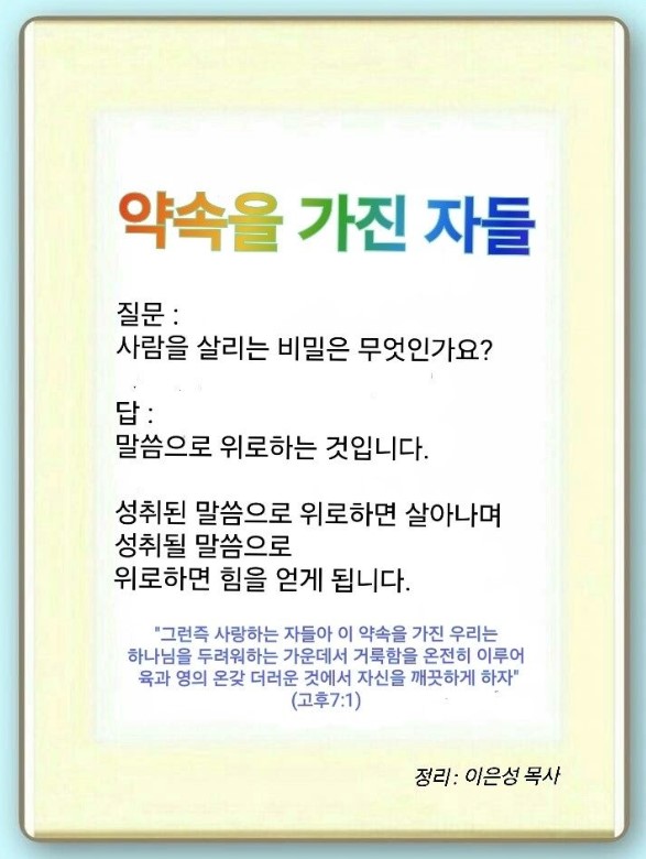 고린도후서 7:1-9 / 그런즉 사랑하는 자들아 이 약속을 가진 우리는 하나님을 두려워하는 가운데서 거룩함을 온전히 이루어 육과 영의 온갖 더러운 것에서 자신을 깨끗하게 하자 (1)