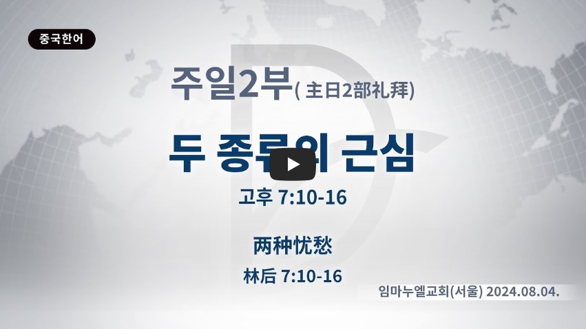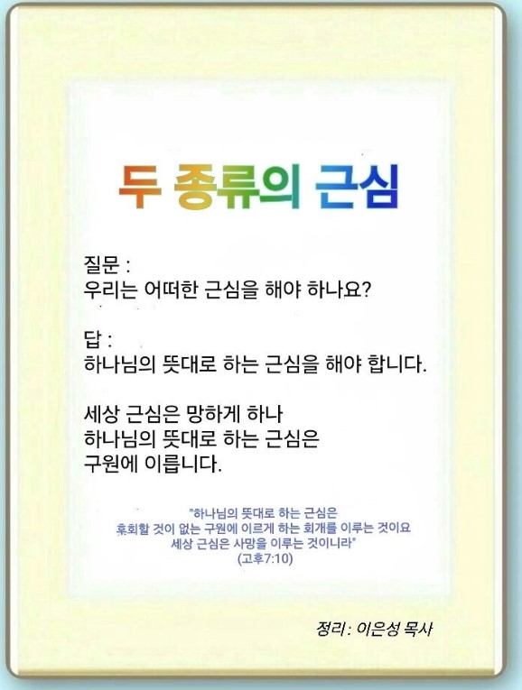 고린도후서 7:10-16 / 하나님의 뜻대로 하는 근심은 후회할 것이 없는 구원에 이르게 하는 회개를 이루는 것이요 세상 근심은 사망을 이루는 것이니라 (10)