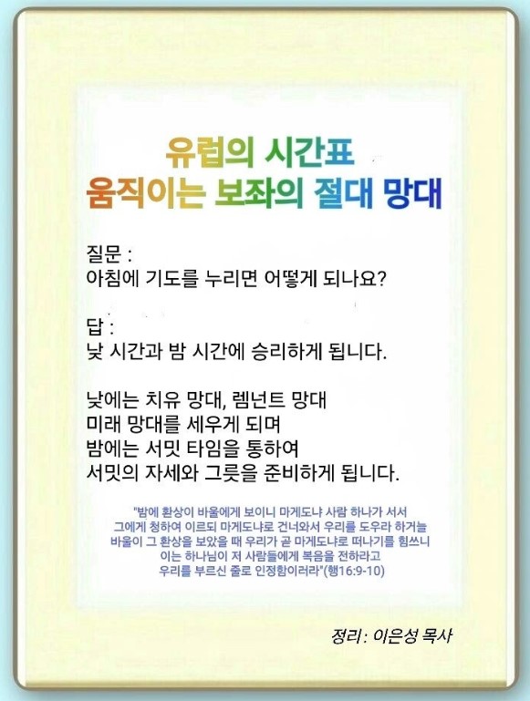 하나님께 감사드립니다. 유럽의 시간표, 렘넌트의 시간표 주신 하나님께 감사를 드립니다. 이제 24의 능력으로 세계를 바꾸게 해 주옵소서. 보좌의 능력으로 유럽을 바꾸게 해 주옵소서. 예수 그리스도의 이름으로 기도하옵나이다. 아멘.