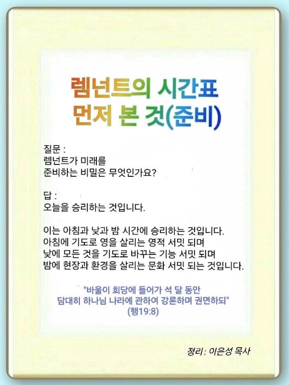 렘넌트들은 10년 안에 나와 가문을 완전히 바꾸고, 선교사의 식주인이 되며, 현장을 살리는 자로 준비되어야 합니다. 렘넌트에게 보좌의 절대 망대가 생기면 됩니다. 호흡을 활용해서 뇌와 영혼, 몸을 살리는 기도를 시작해야 합니다. 렘넌트에게 망대, 여정, 이정표가 이루어지도록 기도하면 됩니다. 렘넌트 시간표의 기준은 먼저 보는 것입니다. 24 기도하면 먼저 보이고, 먼저 본 것을 준비하게 됩니다. 렘넌트가 먼저 보기 위해서 알아야 될 기준이 있습니다. 첫째, 올바른 세계관을 갖는 것입니다. 의식주 중심의 세상 나라, 재앙을 주는 사탄 나라의 흑암을 무너뜨리는 하나님 나라를 아는 것이 올바른 세계관입니다. 둘째, 영원한 세기를(Centry) 보는 하나님 말씀입니다. 하나님의 말씀은 영원한 시간표에 답을 미리 주고 있습니다. 셋째, 왕, 선지자, 제사장입니다. 렘넌트는 이 삼중직을 가지고 세상을 살리는 것입니다.