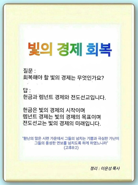 아브라함이 멜기세덱에게 드린 십일조는 빛의 경제의 시작이었습니다. 광야 길에서 완성한 성막과 오바댜, 사르밧 과부, 수넴 여인이 드린 헌금, 학개를 통해 재건한 성전도 빛의 경제의 시작이었습니다. 마가 다락방에 참석한 사람들의 헌금은 세계복음화의 시작이었습니다.(행 2:43-45)