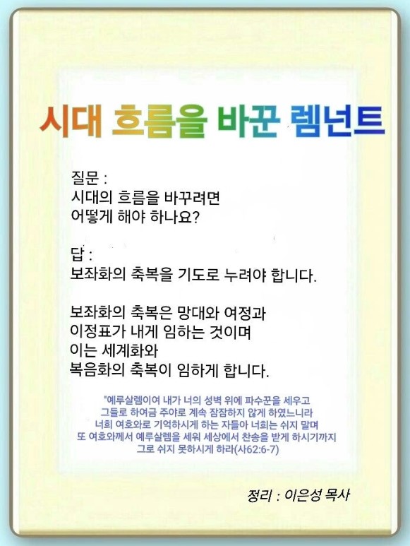 이사야 62:6-12 / 예루살렘이여 내가 너의 성벽 위에 파수꾼을 세우고 그들로 하여금 주야로 계속 잠잠하지 않게 하였느니라 너희 여호와로 기억하시게 하는 자들아 너희는 쉬지 말며 또 여호와께서 예루살렘을 세워 세상에서 찬송을 받게 하시기까지 그로 쉬지 못하시게 하라 (6-7)