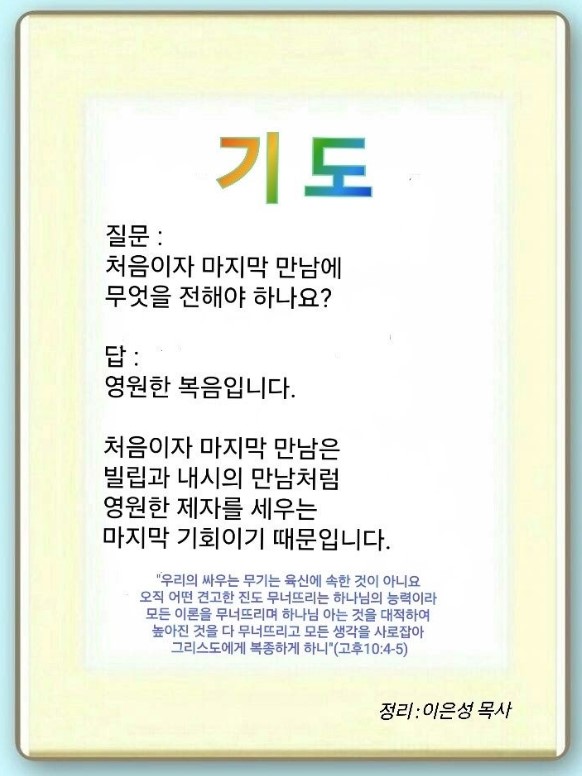성경은 에디오피아 내시가 빌립을 다시 보지 못했다고 기록하고 있습니다. 우리는 만나는 사람에게 처음이자 마지막이요, 영원한 복음을 주어야 됩니다. 그 사람이 영원한 제자로 세워지는 마지막 기회이기 때문입니다. 기도는 하나님이 우리에게 능력을 약속하신 것입니다. 그 능력은 5력과 공중 권세 잡은 자를 이기는 힘입니다. 예수께서 보좌의 능력을 40일 동안 설명하셨습니다. 보좌의 능력은 시공간을 초월합니다. 그래서 전무후무한 응답이 오게 됩니다. 이 보좌의 능력이 각인되면 전달할 수 있습니다. 세계복음화를 하려면 여기에 대한 증거를 먼저 붙잡아야 됩니다.(창 41:38, 45:1-5, 출 5:1-12:46, 삼상 3:19, 7:1-15, 시 78:70-72, 왕하 6:8-24, 단 1:8-9, 행 1:3, 19:8) 기도는 영적 과학입니다. 3단체는 네피림운동을 과학화시켰습니다. 우리는 어느 정도로 기도해야 될까요?