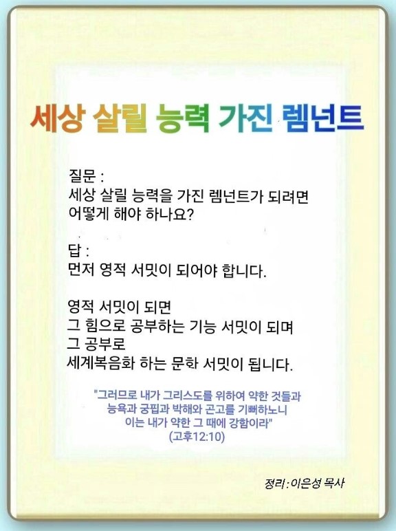 우리는 세상 살릴 능력을 가진 렘넌트를 세워야 합니다. 그래서 렘넌트에게 단순한 성공이 아닌 성공 이후의 것을 가르쳐야 합니다. 이를 위해 렘넌트는 먼저 영적 서밋이 되어야 합니다. 그 힘으로 공부하고,(기능 서밋) 그 공부로 세계복음화해야(문화 서밋) 한다는 것을 가르쳐야 합니다. 이미 3단체가 경제와 문화를 다 장악했습니다. 그래서 우리가 생을 걸고 세 가지 뜰과 금토일 시대를 열어야 하는 것입니다. 그렇다면 무엇부터 가르쳐야 할까요?