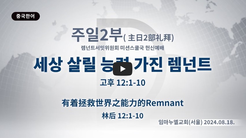 렘넌트의 마음속에 세계복음화를 두면 역사는 시작됩니다.(창 37:11) 하나님은 요셉에게 여호와의 신으로 충만케 하시고,(창 41:38) 세계복음화를 위해 총리가 되게 하셨습니다.(창 45:5) 어릴 때 언약과 기도를 알았던 다윗은(시 78:70-72) 골리앗을 막았고,(삼상 17:1-47) 1천 망대와 성전을 준비했습니다. 이사야가 전달한 언약을 붙잡은 렘넌트가 네 왕을 움직이는 응답을 받았습니다.(단 1:8-9)