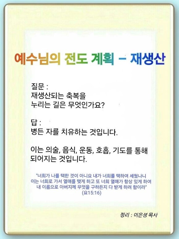 우리는 재생산되는 축복을 누려야 합니다. 재생산의 핵심은 병든 자들입니다. 암이나(질병) 마음과 생각의 병, 영적 문제 가진 자들을 치유하기 위해서 5가지를 개인화시켜 주어야 합니다. 의사의 말과 음식, 운동,(맨발 걷기) 호흡과 기도입니다. 특히 내가 없어지고 하나님만 보이게 되는 것이 최고의 기도 상태입니다. 아침에 호흡하며 기도하고, 잘 때는 말씀을 깊이 묵상합니다. 낮에는 모든 것을 기도로 바꿉니다.(3집중) 그러면 24 기도 리듬이 생기고, 25 하나님 나라가 임합니다. 이때 영원한 응답으로 증인이 됩니다. 그러면 3응답을 받게 되고,(문제, 어려움, 힘든 일 - 답, 갱신, 기회) 기도 속에서 망대를 세우게 됩니다.(플랫폼, 파수 망대, 안테나-3세팅) 호흡은 영육의 면역력을 키우는 최고의 방법입니다. 계속하면 뇌를 살리게 됩니다. 그래서 바울은 병든 자를 먼저 공략했습니다.