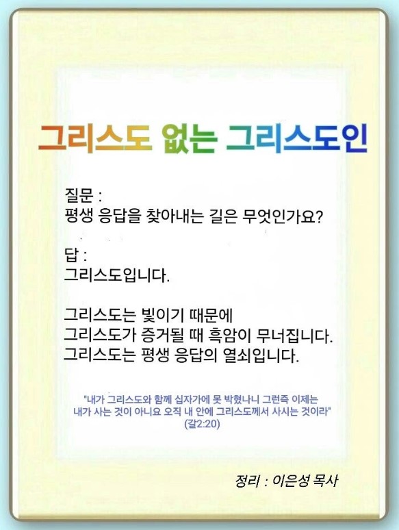 우리는 평생 응답을 찾아내야 합니다. 평생 응답의 열쇠는 복음입니다. 복음은 창 3, 6, 11장에 묶여 멸망 받아서 죽어야 되는 내 안에 그리스도께서 사신 것입니다.(갈 2:20) 그리스도를 놓쳤기 때문에 사람들이 흑암 가운데 빠지게 되었습니다. 가장 큰 문제는 그리스도 없는 그리스도인입니다. 야훼, 메시아, 선민사상만 알고 그리스도를 모르는 유대인, 그리스도 없는 초대교회, 마리아를 섬기는 중세교회는 재앙과 흑암을 이길 수가 없습니다. 그래서 우리는 그리스도로 답이 나야 합니다. 그리스도로 끝낸 바울과 그 팀이 마게도냐, 로마를 복음화했습니다. 그리스도는 빛이기 때문에 그리스도가 증거될 때 흑암이 무너집니다.