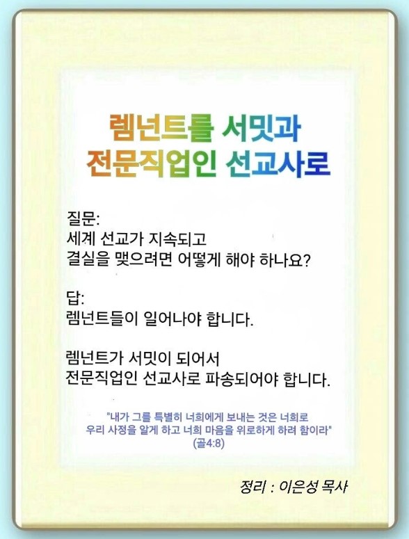 우리는 본업과(주업) 부업이 분명해야 됩니다. 요셉은 본업이 세계 선교이고 부업이 총리였습니다. 렘넌트들이 유랑민인 것 같지만, 사실 선교사로 간 것입니다. 우리의 주업은 세계복음화입니다.