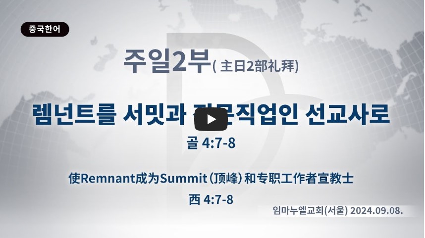 세계 선교하려면 렘넌트들이 일어나야 합니다. 렘넌트가 서밋이 되어서 전문직업인 선교사로 파송되어야 합니다. 하나님께서는 우리에게 7망대, 7여정, 7이정표라는 보좌의 큰 능력을 약속하셨습니다. 이것을 가지고 24 누리면서 25 응답을 기다리다가 영원에 도전하는 것입니다. 이제 2030~2080 시대의 절대 망대를 세워야 합니다. 재앙 시대를 대비해야 하기 때문입니다. 성경에서는 마지막 때에 재앙과 전쟁, 기근이 오게 되지만 모든 민족에게 복음이 증거된 뒤에 끝이 온다고 예언했습니다.(마 24:1-14) 또 고통하는 때가 오는데, 이것은 하나님을 사랑하지 않고 자기를 사랑하기 때문이라고 했습니다.(딤후 3:1-13) 이때 예언의 말씀을 읽는 자, 듣는 자, 지키는 자가 복이 있다고 하셨습니다.(계 1:1-3) 그래서 렘넌트는 세상 나가기 전에 영적 서밋부터 되어야 합니다. 세계 살리는 300%인 전문성, 현장성, 시스템을 준비해야 합니다.