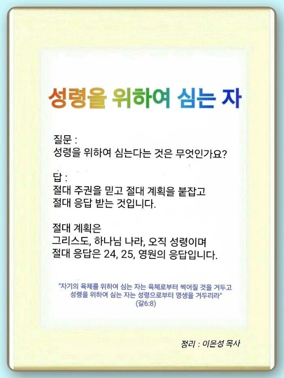 우리는 하나님이 주시는 힘을 얻어야 합니다. 지금부터 3집중을 하면 5력과 공중 권세 잡은 자를 이기는 힘을(엡 2:2) 얻게 되고, 시공간 초월하는 역사가 일어납니다. 기준은 전무후무한 응답입니다. 지금 세계 교회가 문을 닫고 있고, 성도들은 불신자의 종노릇을 하며, 후대는 영적 힘이 없습니다. 그래서 우리는 예수께서 하지 말라고 하신 것과(세상의 복, 육신적인 기도, 옳고 그름을 따지는 신앙생활, 용서, 죄인) 하라고 하신 것을(마 6:10, 10:7, 6:33, 행 1:3) 지켜야 됩니다. 이것을 하지 않아서 교회가 문을 닫고 세계는 재앙에 덮인 것입니다. 유대인은 사탄의 망대 때문에 멸망했습니다.(마 12:26-30, 12:43-45) 베드로와 마가다락방교회는 복음에 반대되는 것을 했기 때문에 세계복음화의 축복을 받지 못했습니다.(행 11:1-18, 갈 2:11-20, 고후 10:4-5) 로마는 문화를 장악한 사탄을 알지 못했습니다.(요 16:11-14, 고후 4:4-5) 성령을 위하여 심는다는 것은 어떤 것일까요?