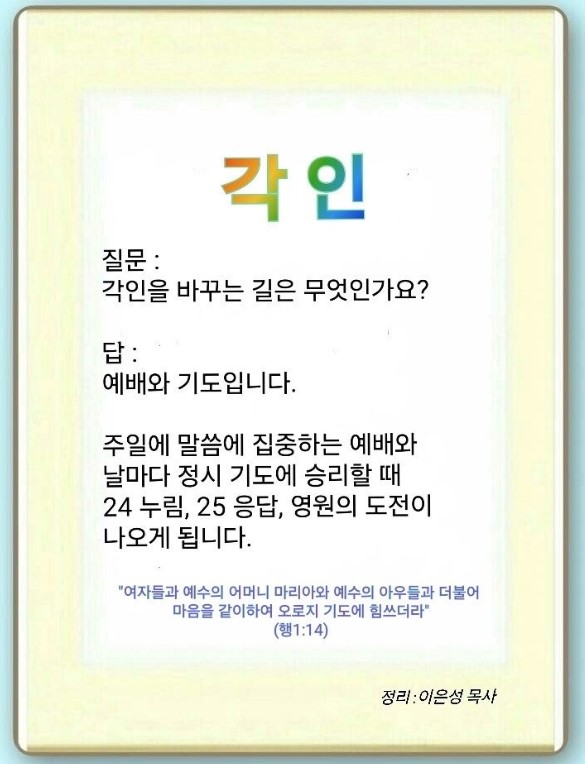 먼저 알아야 할 세 가지가 있습니다. 태영유아 시기는 영적으로 전달되는 시간표입니다. 중고등학생 때는 보는 시간표입니다. 대학, 청년은 체험해야 되는 시간표입니다. 그런데 중고대청은 이미 사탄의 망대로 각인되었습니다.(고후 10:4) 나 중심,(3, 6, 11) 세상 중심으로(13, 16, 19) 각인되었을 뿐만 아니라 영적으로 무능합니다.(6가지) 이것을 뽑아내야 됩니다. 이 12가지를 3단체가 각인시키고 있습니다. 뛰어난 지성인, 종교인, 위인들이 12가지를 가지고 강의합니다. 특히 불교가 큰 영향을 미치고 있습니다. 그 결과 우리는 기도할 수 있는 영적 시스템을 다 뺏겼습니다. 그러다 보니 말씀과 기도, 전도의 흐름을 탈 수 없고, 불신자의 심부름을 하는 상태가 되어버렸습니다. 지금까지 세계 교회는 함께하는 기도를 했습니다.(통성기도, 대표기도, 프로그램 기도) 좋은 기도지만 각인을 바꾸는 것은 혼자 하는 기도입니다.(고요, 평안, 깊음) 예수께서는 3년 공생애 동안 제자들에게 버릴 것을 가르치셨습니다. 그리고 40일 동안 집중하면서 망대를 바꾸게 하셨습니다. 제자들은 10일 동안 마가 다락방에서 기도하고 체험했습니다.(복음을 본 것) 주일에 오로지 기도에 집중하는 것이 예배입니다. 이렇게 되면 매일 말씀과 현장이 실제로 연결됩니다. 이때 나와 교회의 기도 제목이 나옵니다.(정시 기도) 이때부터 누림 24, 25 응답, 영원이라는 도전이 나옵니다.