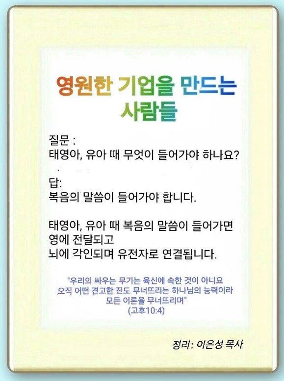 태영아, 유아 때 들어간 것은 반드시 영에 전달되고, 뇌에 각인되며, 유전자로 연결됩니다. 사람들이 영적인 것을 잘 모르고 있는데 반드시 영적 상태에 따라 응답이 옵니다. 지금부터 호흡과 함께 기도 24를 시작해야 됩니다. 어느 날 3집중이 되고, 우리 속에 세팅된 것이 렘넌트에게 전달됩니다.(3세팅) 반드시 3응답이 옵니다. 이러면 태어나면서부터 만들어진 흑암 망대가 무너지고,(고후 10:4) 그리스도께서 주신 망대, 여정, 이정표가 만들어집니다. 이때 가문에서 내려오는 사탄의 함정과(3, 6, 11) 틀, 올무가 치유됩니다. 지금이 가정에서 하나님의 형상이 회복되고,(창 1:27) 영혼에 하나님의 생기가 임하고,(창 2:7) 에덴동산의 축복이 임하는 시간표입니다.(창 2:18) 태영유아 어린이가 있는 모든 집은 미션홈이고, RUTC이며, 지역 살리는 지교회입니다. 이것이 가정의 사명입니다. 교사들은 이것을 도와주면 됩니다.