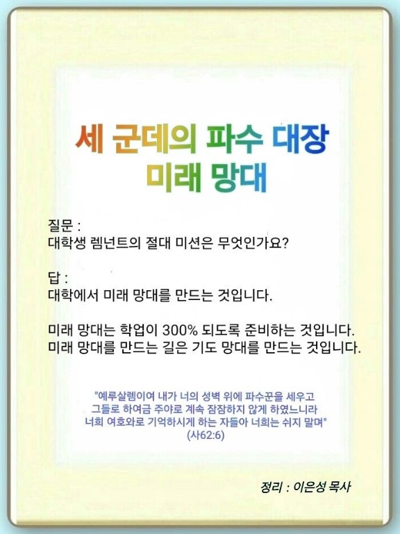 대학에서 미래 망대를 만드는 것이 대학생들의 절대 미션입니다. 기도 망대가 없으면 하나님이 주신 달란트를 찾아내는 것은 물론, 개인의 삶도 어렵습니다. 가정은 하나님의 계획을 가장 빠르고 정확하게 볼 수 있는 곳이며, 문제 속에서 답을 찾는 곳입니다. 렘넌트는 서밋 타임을 통해 기도 망대를 만들고, 미래 시대를 대비하기 위해 금융과 과학, 생명공학, 힐링, 스포츠, 음악, 뇌과학 분야를 이해해야 합니다. 블록체인과 같은 금융제도는 세계화될 것이기 때문에 흐름을 잘 파악해야 합니다. 또 미래를 주도할 과학과 생명공학 분야도 철저히 준비해야 합니다. 힐링 시스템이 없으면 교회가 어려움을 겪게 될 것입니다. 그래서 힐링 24시스템을 구축해야 합니다. 뇌과학 시대를 대비해야 합니다. 정신병자들이 급증할 것이기 때문입니다.