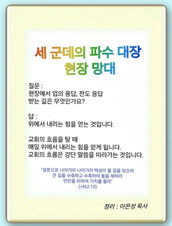 시대가 급하기 때문에 여러분은 증인이 되어야 합니다. 기도의 망대를 세워야 하나님께서 주신 지속적인 달란트가 발견됩니다. 여러분의 학업은 미래 망대가 되어야 합니다. 그리고 현장 망대도 세울 수 있어야 합니다. 그래서 위에서 내리는 힘이(Tacit Power) 필요합니다. 예수께서는 3년 동안 틀린 것을 버리고, 성령의 임재를 누리라고 하셨습니다. 초대교회가 예수께서 40일 동안 가르치신 망대와 여정, 이정표의 언약을 붙잡고 10일 동안 집중했는데 최고 약속이 성취되었습니다. 주일과 예배가 살아났고, 날마다 성전과 집에서 말씀운동이 일어났습니다. 또한 정시 기도와 24‧25‧00의 축복이 시작되었습니다. 이것이 교회의 흐름입니다. 이때 매일 누려야 할 힘이 나옵니다. 7‧7‧7로 3집중하면 3세팅과 3응답을 누리게 됩니다. 지금은 미디어로 모든 것을 움직이는 시대입니다. 앞으로 올 재앙을 대비하여(컨셉) 치유(콘텐츠) 시스템을 만들어야 합니다.