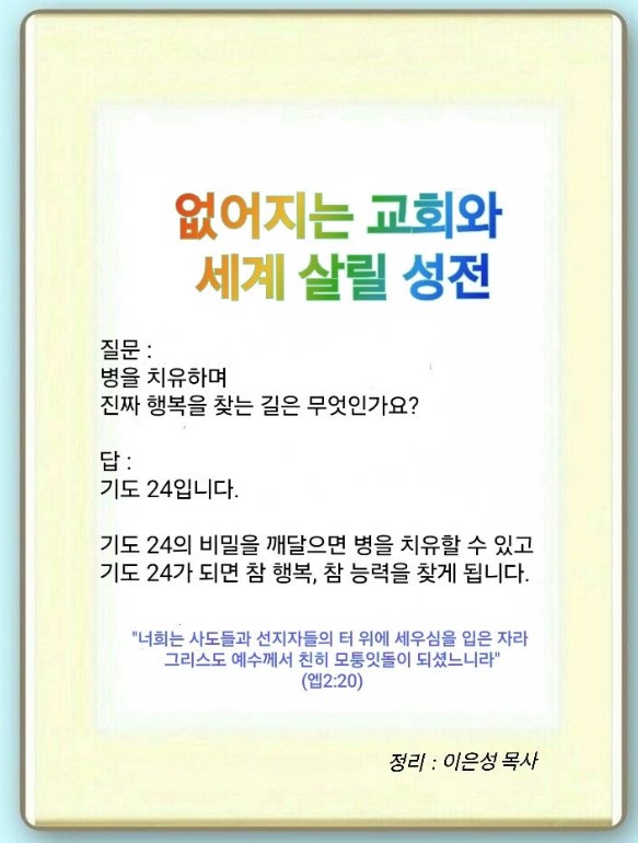 세계 교회가 문을 닫고 있습니다. 그러나 아무도 여기에 관심이 없습니다. 하나님은 안디옥교회에 세계적인 축복과 세계 살릴 능력, 빛의 경제를 주셨습니다. 하나님은 여기에 바울을 보내시고 모든 축복을 주셨습니다. 그것은 이방인의 뜰, 치유의 뜰, 아이들의 뜰에(회당) 눈을 돌렸기 때문입니다. 바울은 다민족 시대, RT, TCK 시대를 열어 치유운동, 서밋운동을 일으켰습니다. 그래서 우리는 교회와 성전을 놓고 24 기도하는 팀을 구성해야 합니다. 24 기도의 비밀을 깨달으면 모든 병을 치유할 수 있습니다. 그리고 진짜 행복을 찾아내게 됩니다. 기도 24가 되면 보좌를 움직이는 축복, 참 행복, 참 능력을 찾아내게 됩니다. 그렇다면 우리는 어떤 성전을 지어야 할까요?