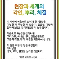 많은 성도가 교회에서의 갈등과 시험으로 축복을 놓쳐 세계 교회, 선교지, 한국 교회가 어려움 가운데 놓였습니다. 세상을 살리려면 우리 스스로는 물론, 우리 교회가 살아야 합니다. 초대교회에 임했던 성령의 역사가 우리 교회에도 각인, 뿌리, 체질이 되어야 할 이유가 바로 이것입니다(사도행전 2:1~4). 그 방법으로 우리의 삶(5가지 기도원리, 21가지 전도자의 삶, 9가지 포인트), 모임, 교육이 자체 캠프가 되어야 합니다. 이때 오는 응답이 있습니다.