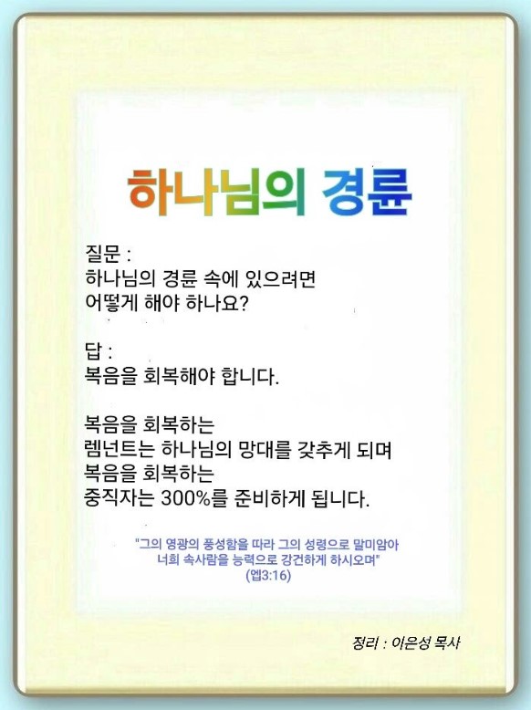 복음이 없어진 증거로 세 가지 시대, 마약·동성애 시대, 정신병 시대, 전쟁 시대가 올 것입니다. 그래서 우리는 재앙 속에 남는 자로 준비해야 합니다. 새가족은 마 16:16의 고백 이후 주신 세 가지 축복과 보혜사 성령, 그리고 하나님 나라의 일과 약속하신 것을 기다리면 됩니다. 렘넌트는 망대를 갖추고, 중직자는 완벽하게 성령 인도받아서 응답받는 300%를 준비하면 됩니다. 보좌의 망대를 만들고 보좌의 여정을 가면, 보좌의 이정표가 우리의 이정표가 됩니다. 우리는 하나님의 경륜인, 하나님의 절대 계획 속에 나, 산업, 교회, 후대가 있어야 합니다.