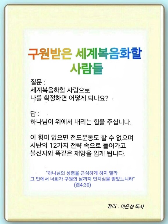 우리가 구원받은 자의 언약을 누리고 있으면 상대가 속사람을 보이게 됩니다. 그때 내가 가진 구원을 전달하는 것이 전도입니다. 마 4:19의 언약을 잡고 있으면 답을 받을 사람이 오거나 만나게 되는데 그때 답을 주면 됩니다. 이때부터 빛의 경제가 오게 됩니다.(행 2:43-45)