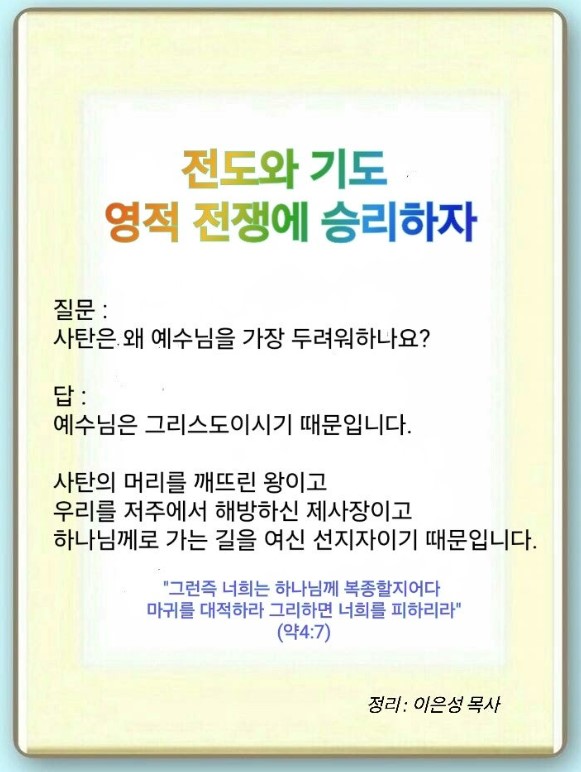 우리가 영적인 전쟁에서 승리하려면 세 가지를 분명히 알아야 합니다. 첫째, 구원받은 자는 과거, 현재, 미래를 그리스도께서 한 번에 해결하신 것을 알고 있습니다. 둘째, 영적인 적이 있음을 알고 있어야 합니다.(창 3:1-4, 고후 11:14, 엡 6:11, 13, 16) 셋째, 인간의 절대적인 문제를 해결하는 그리스도를 알고 사탄에게 눌린 자를 해방시키는 것이 사명임을 아는 것입니다.