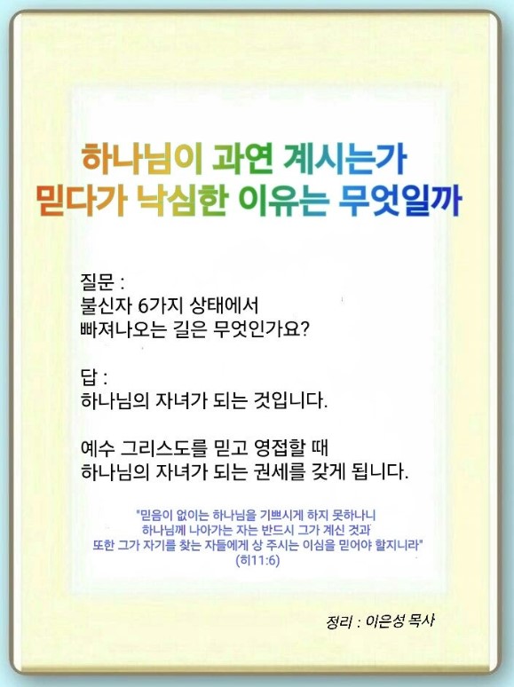 신자의 50%가 하나님 계시는가에 대한 질문을 합니다. 확실한 영원한 망대, 여정을 내 속에, 교회에, 산업에 세우고 영원한 이정표를 가는 것입니다. 교회 안에도 무신론자, 근본 문제에 답이 없어 원죄 해결이 안 되는 성도가 많습니다. 불신앙의 결과로 불신자 6가지 상태에 빠지게 되는 것을 모르는 성도도 많습니다. 길은 하나밖에 없습니다. 하나님 자녀가 되어 그 권세를 누리는 것입니다. 바꿀 것, 버릴 것, 찾을 것을 보게 해서 성령 인도받게 도와야 합니다.