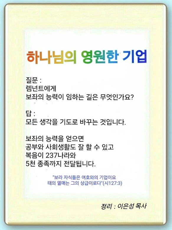 지금부터 렘넌트의 모든 생각을 기도로, 모든 호흡을 능력으로 바꿔야 합니다. 그래야 성령의 능력과 보좌의 능력이 임합니다. 마가 다락방과 안디옥의 능력이 나타나고, 열린 문과 시대 전환점, 로마가 보이도록 기도해야 합니다. 이때 살아가는 힘과 하나님이 주시는 힘을 얻어야 공부와 사회생활도 할 수 있습니다. 하나님의 영원한 기업을 알면 요셉, 모세, 다윗처럼 응답 받게 됩니다. 성경은 여호와의 기업이 237, 5천 종족의 후대라고 말씀합니다.(시 127:3) 복음은 빛과 생명, 길이기 때문에 237, 5천 종족까지 전달됩니다. 기도는 성삼위 하나님의 능력과 보좌의 능력이 시공간을 초월하는 것입니다. 이를 알았던 렘넌트 7명은 With, Immanuel, Oneness를 누려, 오직·유일성·재창조의 응답을 받았습니다. 이 힘을 누리는 것이 24입니다.