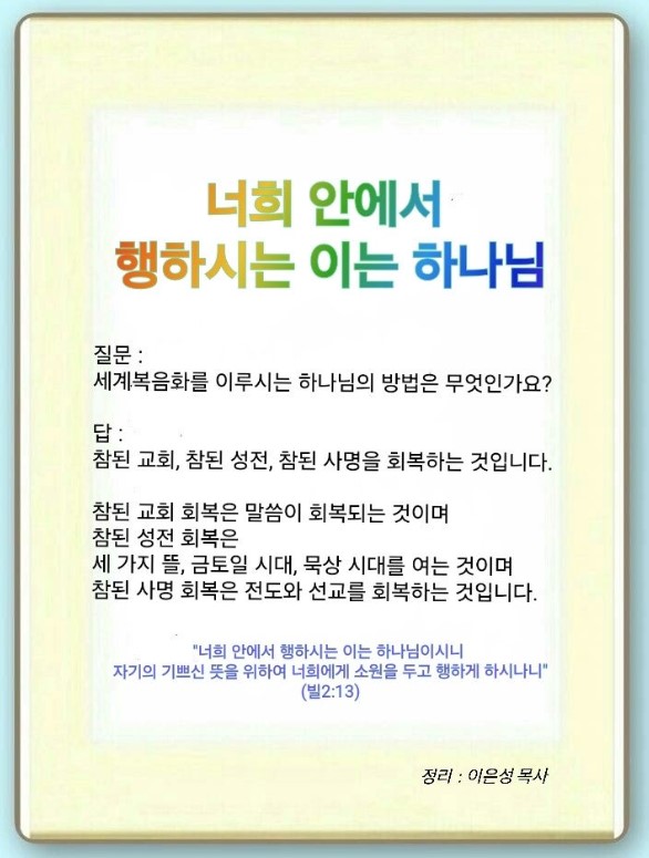 그리스도께서 교회를 향하여 주신 말씀을 회복해야 됩니다. 우리는 세계 살릴 망대, 여정, 이정표를 세우는 파수꾼이 되어야 합니다.
