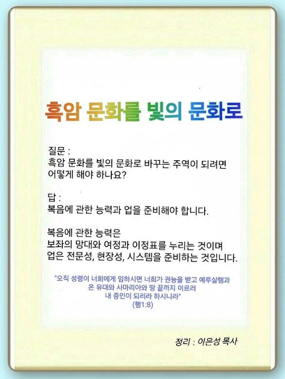 렘넌트들은 흑암 문화를 빛의 문화로 바꾸는 일의 주역입니다. 그래서 렘넌트 때 두 가지 준비를 해야 합니다. 첫째, 복음에 관한 능력을 300% 준비해야 합니다. 하나님이 내게 주신 망대 100%, 여정 100%, 이정표 100%를 준비하는 것입니다. 둘째, 업을 300% 준비해야 합니다. 업의 내용 100%, 현장성 100%, 지속을 위한 시스템 100%를 준비하는 것입니다. 이것이 성령 충만입니다. 예수께서 성령 충만 받으면 증인이 된다고 말씀하셨습니다. 렘넌트들은 그리스도께서 주신 것을 기도로 찾고, 성령 충만을 받으면 됩니다.