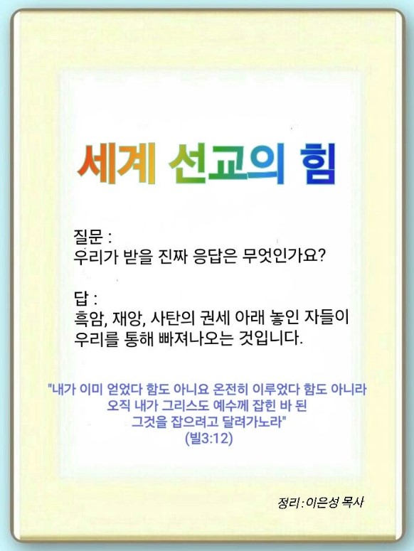 흑암과 재앙, 사탄의 권세 아래 놓인 자들이 우리를 통해 거기서 빠져나오는 것을 보는 것이 우리가 받을 진짜 응답입니다. 그래서 하나님은 세 절기 회복을 통해 우리의 신분과 권세, 배경을 회복시키셨습니다. 그리고 보좌의 망대와(오직) 여정,(유일성) 이정표를(재창조) 주셨습니다. 이 세 가지를 누리는 것이 응답입니다. 우리가 이 사실을 깨닫지 못하면, 교회가 전도를 못하게 됩니다. 그러면 후대의 재앙을 막지 못하고, 영적 질병이 세계화됩니다. 이것이 우리가 선교를 해야 하는 이유입니다.
