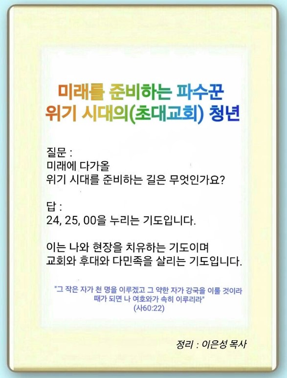 항상 기도로 24, 25, 영원을 하는 것입니다. 항상 나와 현장을 치유하는 24, 25, 영원을 해야 됩니다. 항상 세계화와 복음화에 24, 25, 영원 해야 됩니다.(세계복음화) 그러면 어느 날 교회와 전도자, 후대와 다민족이 살아나게 될 것입니다.(사 60:20-22)