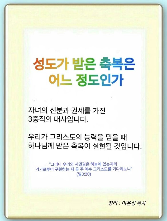 신분에 따라 권세가 생깁니다. 하나님께서는 천군 천사들을 보내사 우리를 도우시고, 사탄과 흑암을 이길 수 있는 권세를 주셨습니다. 또한, 영원한 생명을 가진 천국 백성으로서(빌 3:20) 세계복음화할 수 있는 축복을 주셨습니다.