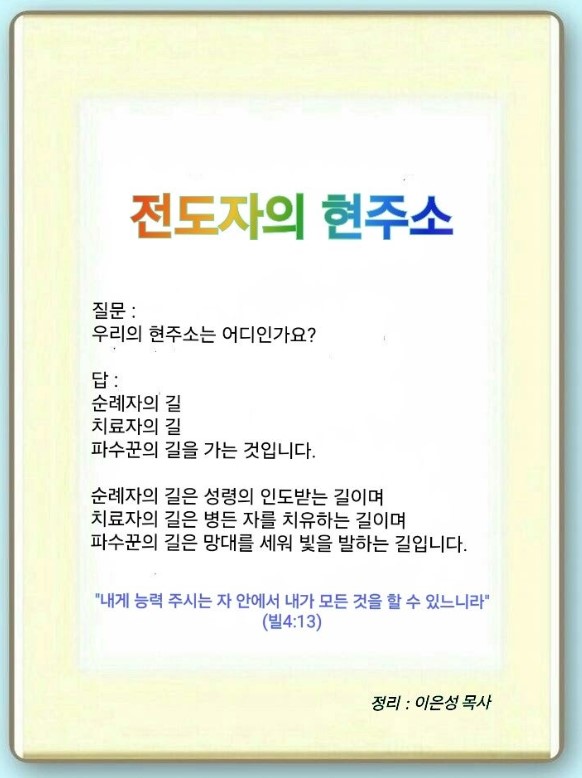 우리가 가는 길에 병든 자가 많기 때문에 치유해야 합니다. 예수께서 “내 이름으로 귀신을 쫓아내고 병든 자에게 손을 얹은즉 나으리라.”(막 16:15-20) “성령 충만 받으면 권능 받고 땅끝까지 증인 되리라.”(행 1:8) 라고 하셨습니다. 이 언약을 붙잡은 바울은 흑암과 점술에 덮인 동네를 치유하고, 두란노에서 불치병을 치유했습니다.(행 13, 16, 19장) 이것이 현장 100%입니다.