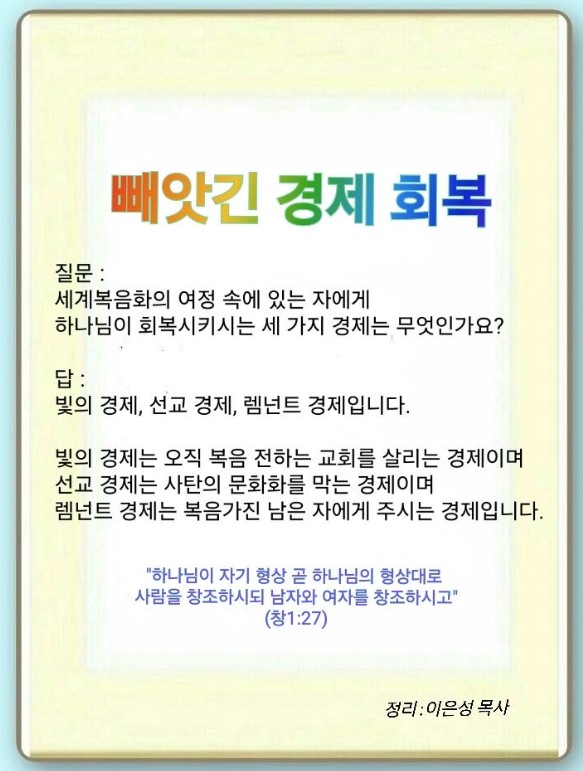 하나님은 가장 먼저 창조의 빛을 비추셨고,(창 1:1-3) 영광의 빛을 발하라고 하셨습니다.(사 60:1-3) 예수 그리스도가 빛으로 오셨습니다.(요 1:11-12) 오직 복음 전하는 교회에 헌금하는 것은 빛의 경제가 됩니다. 무엇을 하든지 복음에 유익하게 하면 하나님이 빛의 경제를 쏟아부으십니다.