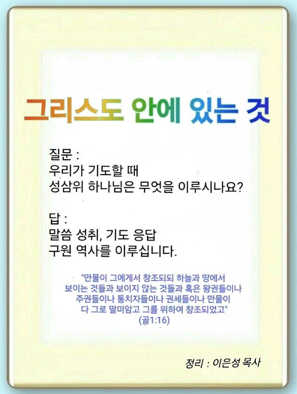 참된 능력은 그 근원을 회복하는 것입니다. 그리스도는 눈에 안 보이는 하나님의 형상입니다. 그리스도를 통해 우리에게 모든 신령한 지혜와 총명을 주시고,(골 1:9) 하나님을 알게 하시고, 그 뜻을 발견케 하는 것입니다.(골 1:10) 또 그리스도 안에 영광의 힘을 따라 모든 능력으로 능하게 하실 것을 믿어야 합니다.(골 1:11)