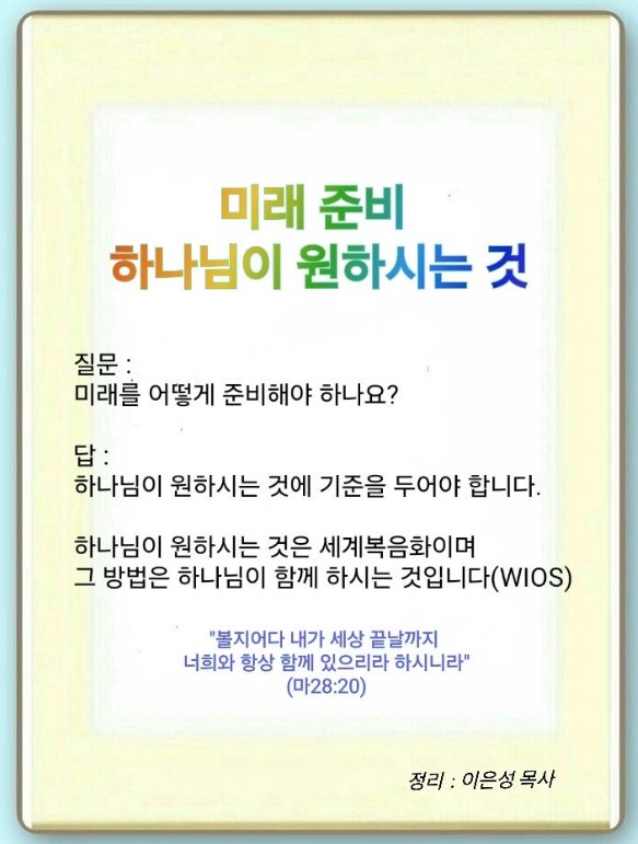 우리는 지금부터 미래를 준비해야 합니다. 그런데 미래는 우리가 마음대로 할 수 없기 때문에 하나님이 원하시는 것에 기준을 두어야 합니다. 하나님이 원하시는 것을 끊임없이 질문해야 합니다. 예수께서는 부활하셔서 모든 민족, 만민에게 가라,(마 28:16-20, 막 16:15-20) 어린 양을 먹이라,(요 21:15-18) 땅끝까지(행 1:8) 가라고 하셨습니다. 세계복음화를 말씀하신 것입니다. 이것은 우리 힘으로는 절대 할 수 없습니다.(절대 불가능) 그래서 예수께서는 절대 가능을 말씀하셨습니다. 보좌의 능력을 약속하신 것입니다. 보좌의 능력은 시공간을 초월하기 때문에 237-5천 종족을 살릴 수 있습니다. 그리고 우리에게 전무후무한 응답을 주셨습니다. 이것으로 절대 망대를 세우는 것입니다. 이때부터 진짜 헌신이 나옵니다.(3뜰, 금토일시대, TCK·CCK·NCK) 이제 하나님께서 주신 7·7·7 망대를 누려야 합니다.(24) 25 응답이 올 때까지 기다리며 누리다가, 영원한 것에 도전하는 것입니다. 명심할 것이 있습니다. 교회 안의 율법주의, 세속주의, 신비주의, 계산주의, 이념주의를 조심하고, 오직 그리스도의 세 가지 기준에 맞춰야 합니다.