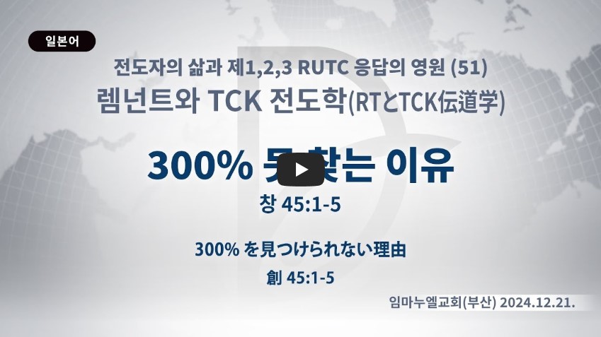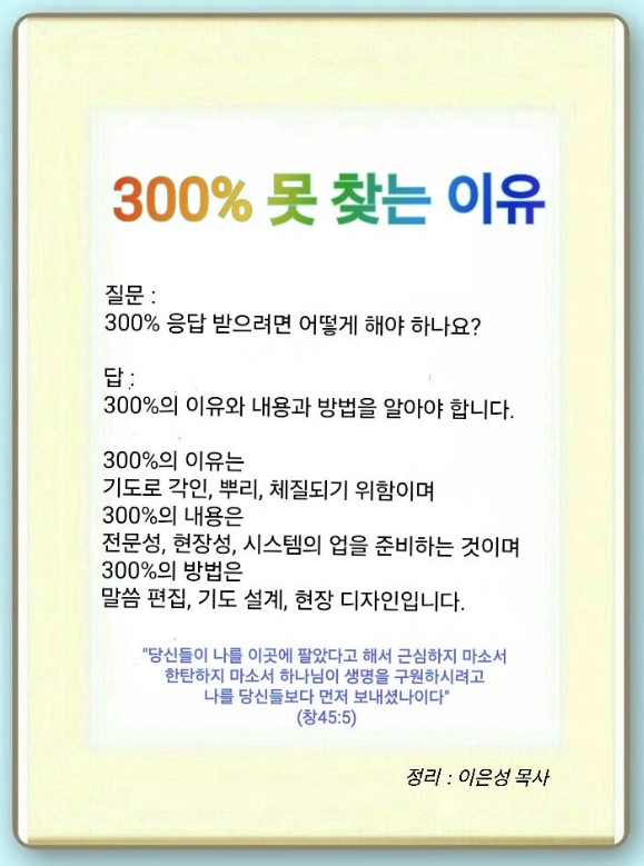 300%의 내용을 알아야 합니다. 이것은 렘넌트가 반드시 준비해야 할 것입니다. 기도를 알면, 달란트가 보입니다. 이 달란트에 대한 전문성 100%를 준비하는 것입니다. 그리고 시대를 보는 현장성 100%를 준비하는 것입니다. 기도하면 이것이 보입니다. 마지막으로 지속하는 시스템 100%를 준비하면 됩니다. 이것은 아주 중요하기 때문에 렘넌트가 반드시 기억해야 합니다.
