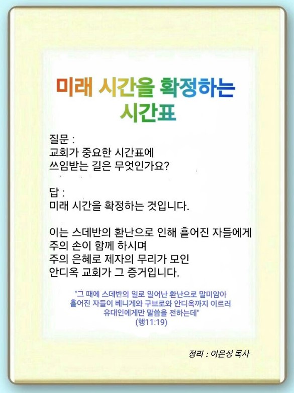 안디옥교회는 아주 중요한 시간에 쓰임 받았습니다. 그 이유는 미래 시간을 확정했기 때문입니다. 우리는 성전 건축을 하는 동안 안디옥교회가 회복한 3경제 축복을 받아야 됩니다. 빛의 경제와(헌금, 십일조) 선교 경제,(선교, 3뜰이 있는 성전) 렘넌트 경제를(시대 경제) 회복한 것입니다. 먼저 확인해야 할 세 가지 일이 있습니다. 첫째, 스데반의 일입니다. 스데반은 단 한번 복음을 전하고 비참하게 죽었습니다. 그때 스데반은 성령에 충만하여 하늘 문이 열린 것과 보좌에 서신 예수 그리스도를 보았습니다. 성경은 “스데반은 자니라.”라고 기록하고 있습니다. 둘째, 그 뒤에 더 큰 위기를 만났습니다.(행 12:1-25) 많은 사람이 도망가고 남은 자들이 중직자 중심으로 모여 기도했습니다. 그때 하나님은 천사를 보내사 베드로를 풀어주고 헤롯 왕을 불러갔습니다. 셋째, 스데반의 환난으로 인해 흩어진 자들에게 주의 손이 함께했습니다. 주의 은혜로 제자의 큰 무리가 모였습니다. 이곳이 안디옥교회입니다. 그렇다면 우리는 무엇을 해야 할까요?
