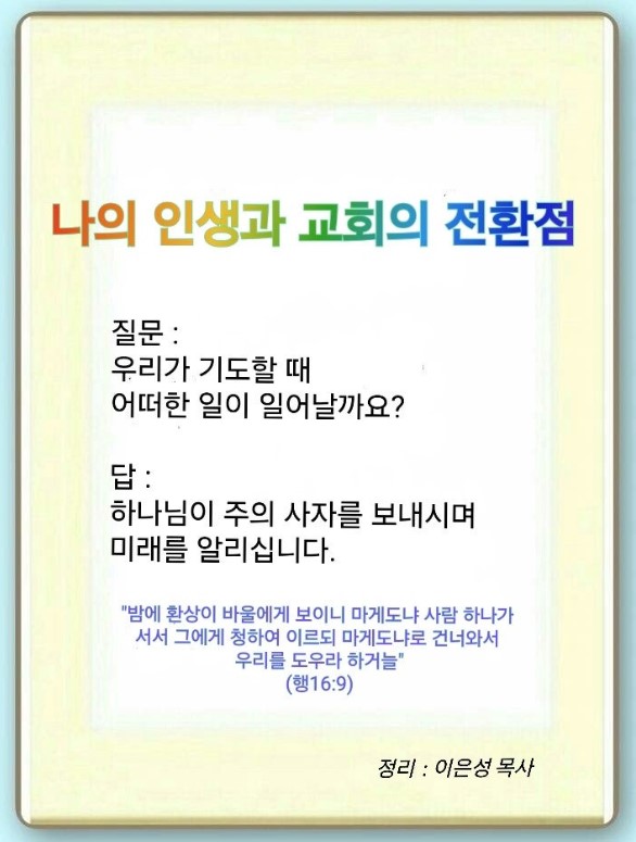 요한 번연은 복음을 전하다가 감옥에 갇혔습니다. 이때 그는 천로역정이라는 작품을 써서 전 세계를 뒤집었습니다. 길이 막힐 때 사람들은 대부분 포기합니다. 종교는 심은 대로 거둔다고 가르치고, 불교는 다음 생이 있으니 참으라고 합니다. 어떤 사람들은 점을 치러 가서 귀신의 인도를 받습니다. 우리를 인도하시는 것은 주의 영입니다.(행 16:6-7) 우리가 기도할 때 하나님께서 주의 사자를 보내시고 미래를 알리십니다.(행 16:9) 그래서 우리는 예수께서 주신 망대, 여정, 이정표 속에서 언약을 잡아야 합니다. 바울은 이것을 알고 깊은 기도 속으로 들어갔습니다.