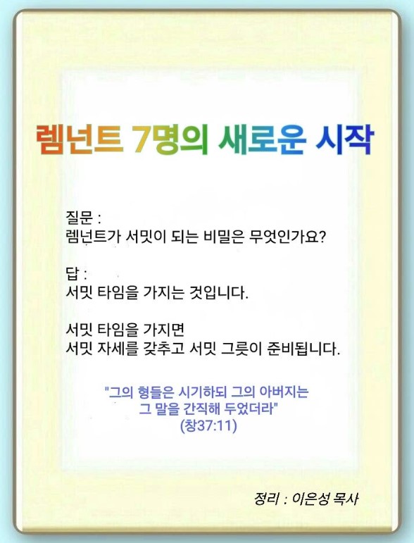 렘넌트는 반드시 서밋이 될 것입니다. 그래서 이제부터 서밋 타임을 가져야 됩니다. 이 속에서 서밋 자세를 갖추고, 서밋 그릇을 준비하면 됩니다. 기도를 하지 않으면 자신이 얼마만큼 응답을 받았는지 알 수 없습니다. 앞으로 무슨 응답을 받게 될 것인지도 알기 어렵습니다. 렘넌트가 매일 5분만이라도 기도하면서 하나님께 질문하면 중요한 것을 보게 됩니다.
