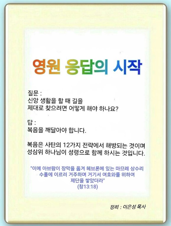 신앙생활을 할 때 길을 제대로 찾으려면 첫째, 먼저 복음을 깨달아야 합니다. 복음은 사탄의 12전략에서 해방된 것입니다. 그리고 성삼위 하나님이 성령으로 우리 안에 함께 계시는 것입니다. 하나님이 나와 함께하시기 때문에 더 이상 나에 대한 것이 필요 없습니다. 둘째, 내 업을 가지고 세계복음화에 쓰임 받으려면 정확하고 사실적일수록 좋습니다. 렘넌트 7명의 특징은 세계복음화를 어떻게 할지 스케줄이 나와 있었다는 것입니다. 세계복음화의 길을 안 요셉에게는 가는 모든 길이 응답이었고, 모세는 80세에 세계복음화의 길을 찾았습니다. 사무엘과 다윗은 어릴 때부터 세계복음화의 언약을 깨달았습니다. 우리는 어떻게 이 응답을 받을 수 있을까요?