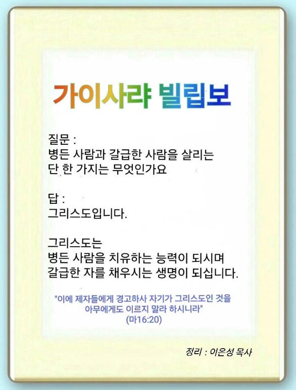 마태복음 16:20 / 이에 제자들에게 경고하사 자기가 그리스도인 것을 아무에게도 이르지 말라 하시니라