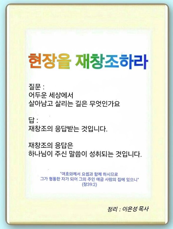 요셉의 형들이 요셉을 죽이려고 하다가 노예로 팔았습니다. 요셉은 애굽으로 끌려가서 친위 대장 보디발의 집에 도착합니다. 거기서 요셉의 중요한 인생이 시작됩니다. 그 현장을 재창조한 것입니다. 우리는 재창조의 응답이 없으면 살아남을 길이 없습니다. 재창조의 응답을 모르면 평생 불신자 심부름만 하다가 죽어야 됩니다. 90%의 사람들은 엄청난 축복이 와 있는 것을 모르고 있고, 10%의 사람들은 안 되는 것을 된다고 합니다. 우리는 반드시 하나님의 절대 계획이 무엇인지 질문해야 합니다. 이것이 기도 중 기도입니다. 어떤 경우에도 하나님의 계획을 찾으면 이길 수 있고, 견딜 수 있습니다. 그러면 하나님이 살아 계셔서 내게 응답하심을 느끼고, 증인이 됩니다. 그렇다면 재창조의 응답은 무엇일까요?