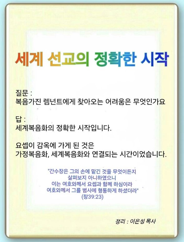 세계 선교는 해야 하는 우리 앞에 어려움이 생기기도 합니다. 이때 많이 흔들리게 됩니다. 애굽에 큰 재앙이 들이닥칠 때 복음 전할 한 사람이 요셉입니다. 그런데 요셉은 감옥에 가게 되었습니다. 이것이 세계 선교의 정확한 시작이었습니다. 감옥에서의 시간은 세계복음화의 꿈과 연결되는 시간이었습니다. 하나님은 아브라함에게 처음부터 세계 선교할 것을 약속했습니다.(창 12:1-3) 이후에 일어나는 사건이 전부 세계복음화로 가는 길이었습니다. 하나님은 40년 동안 미디안에 숨어 있던 모세를 부르셔서 출애굽의 놀라운 역사를 일으키셨습니다.(출 3:1-20) 다윗은 수십 년을 쫓겨 다녔는데, 이것이 1천 망대를 세우고 성전을 준비할 제자들이 모이는 길이었습니다. 바벨론에 포로가 되고, 로마의 속국이 되었습니다. 그런데 그곳에 흑암, 전염병을 막을 237나라, 5천 종족의 사람이 와 있었던 것입니다. 우리는 어떤 응답을 받고 전달해야 할까요?