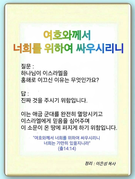 오늘 언약이 각인되게 해 주옵소서. 홍해를 가르는 역사를 하나님께서 행하시는 일을 보게 해 주옵소서. 우리 산업에, 학업에, 현장에 홍해 갈라지는 역사가 일어나게 해 주옵소서. 주 예수 그리스도 이름으로 기도하옵나이다. 아멘