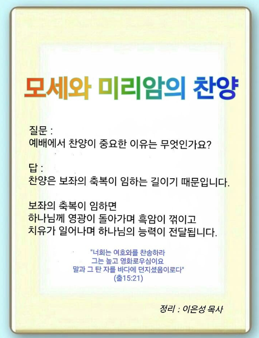 출애굽기 15:19-21 / 미리암이 그들에게 화답하여 이르되 너희는 여호와를 찬송하라 그는 높고 영화로우심이요 말과 그 탄 자를 바다에 던지셨음이로다 하였더라 (21)